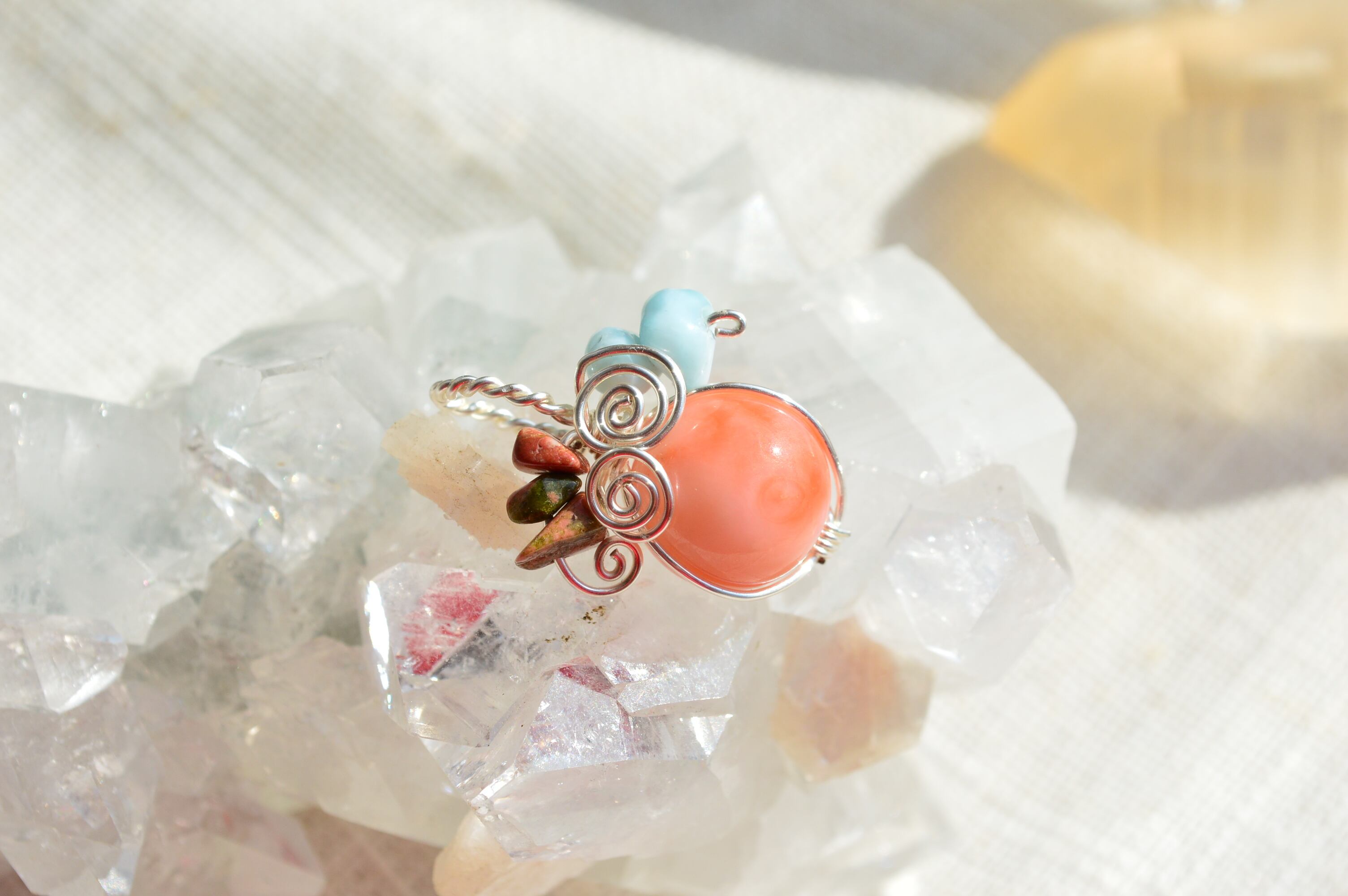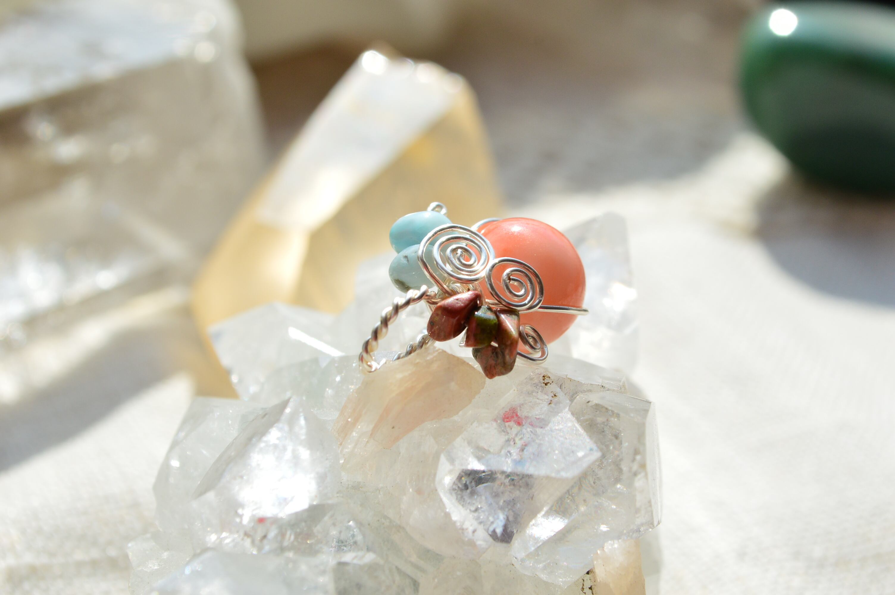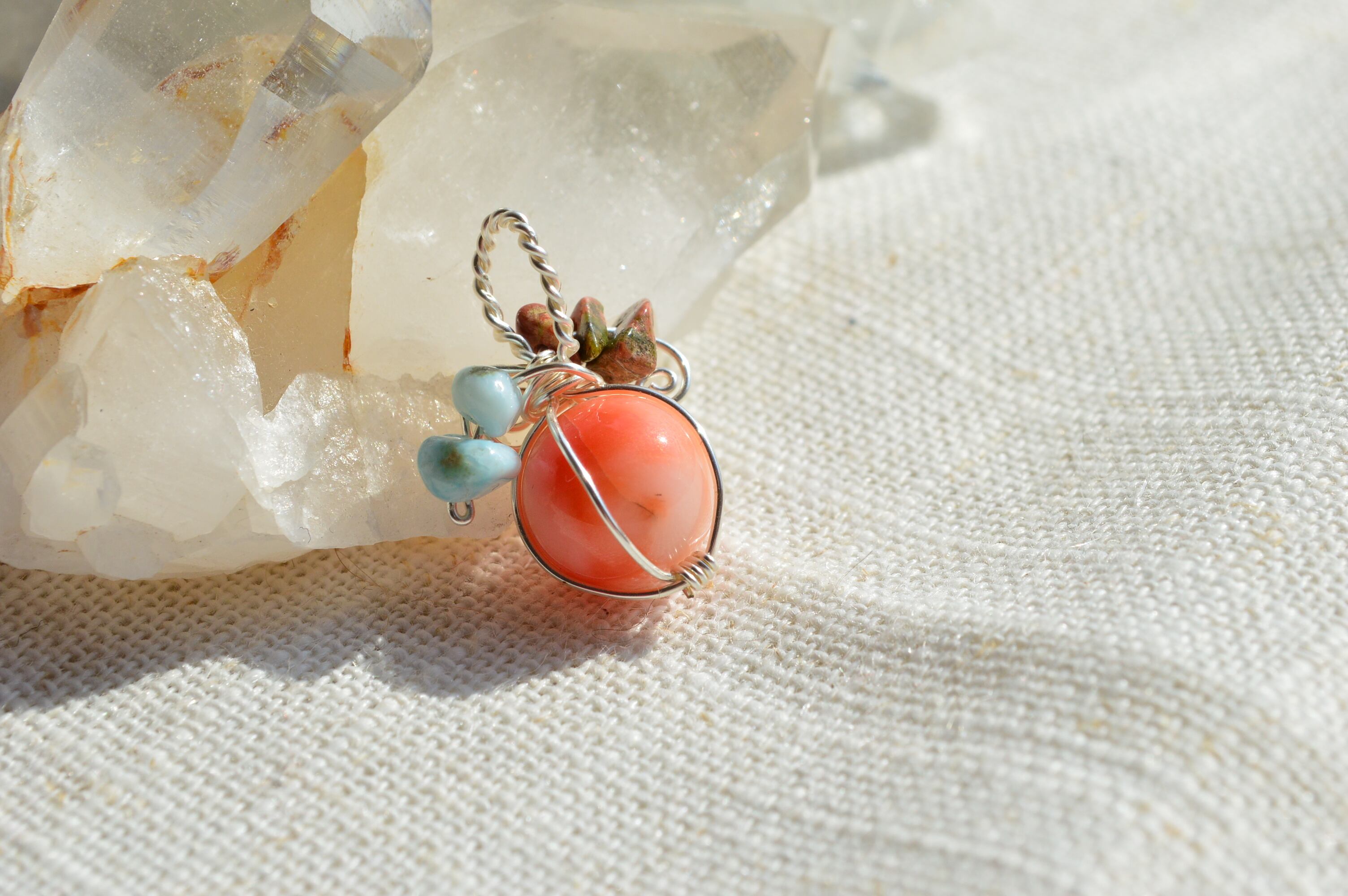 ピンクコーラルの優しく深い愛を、ラリマーとユナカイトが手をつなぎあって、私たちへと橋渡ししてくれているように感じます。