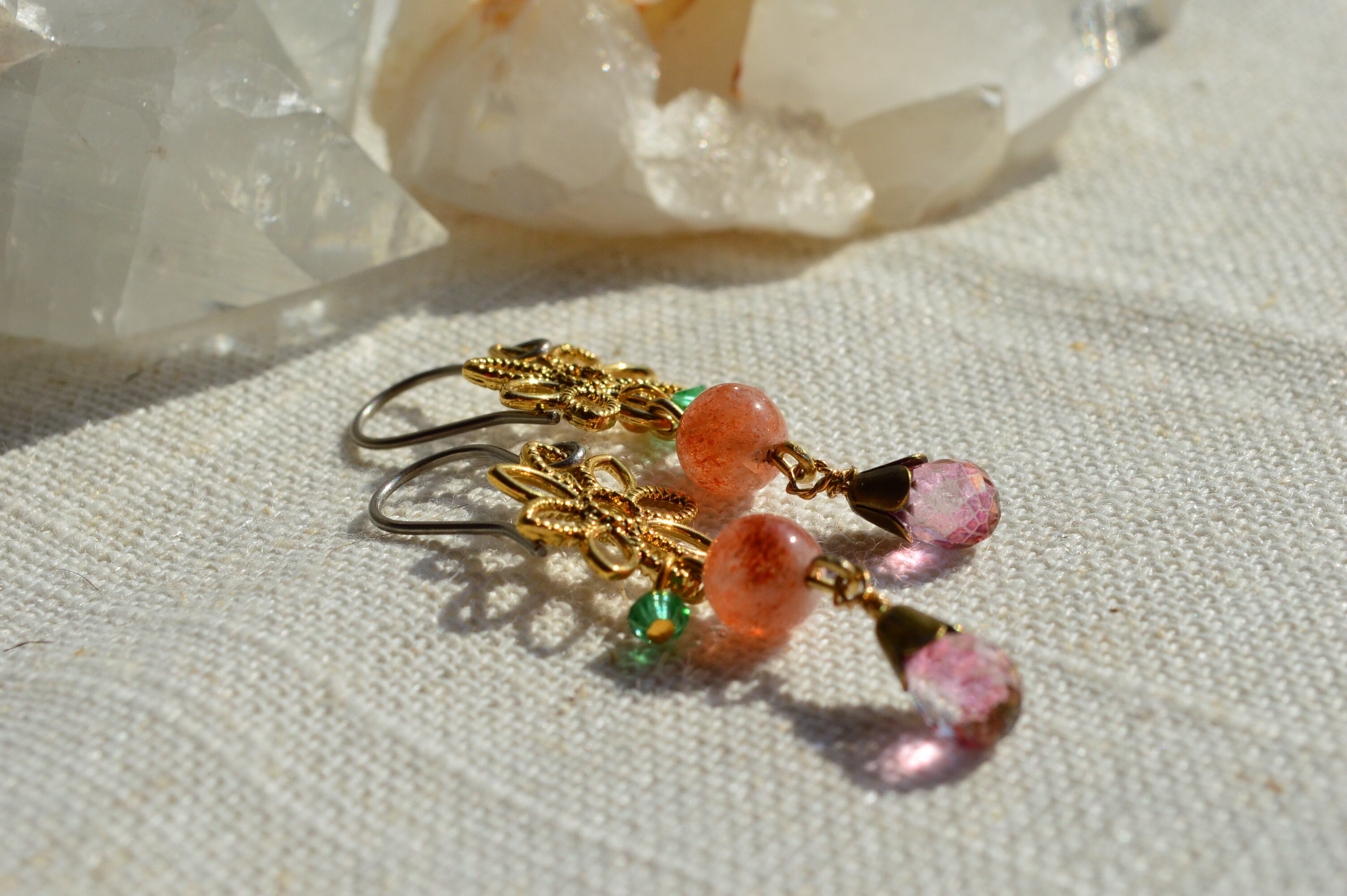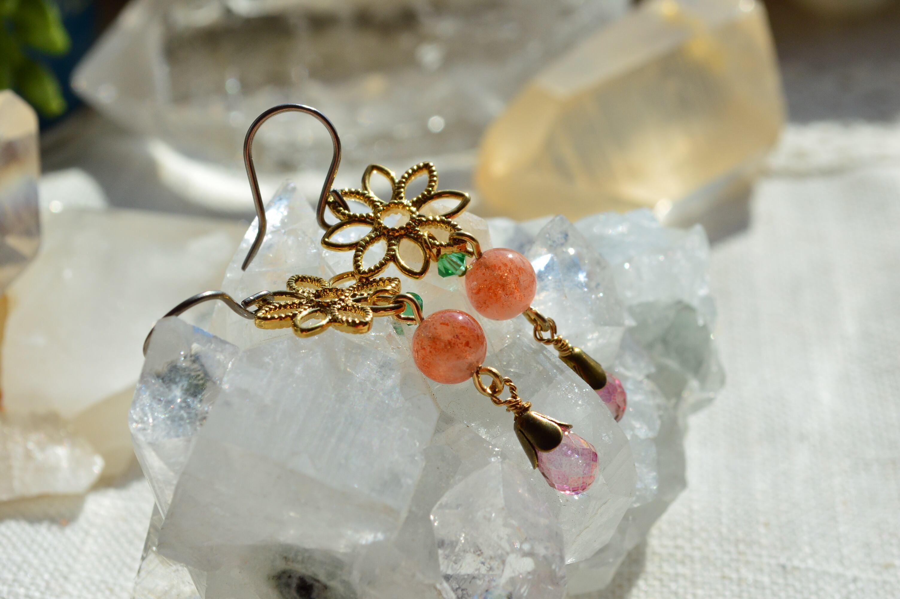 可愛いピンクトパーズを使いたくて作ったピアスになります(^^)キラキラと良く光るサンストーンとで、華やかで元気の出る組み合わせになりました!