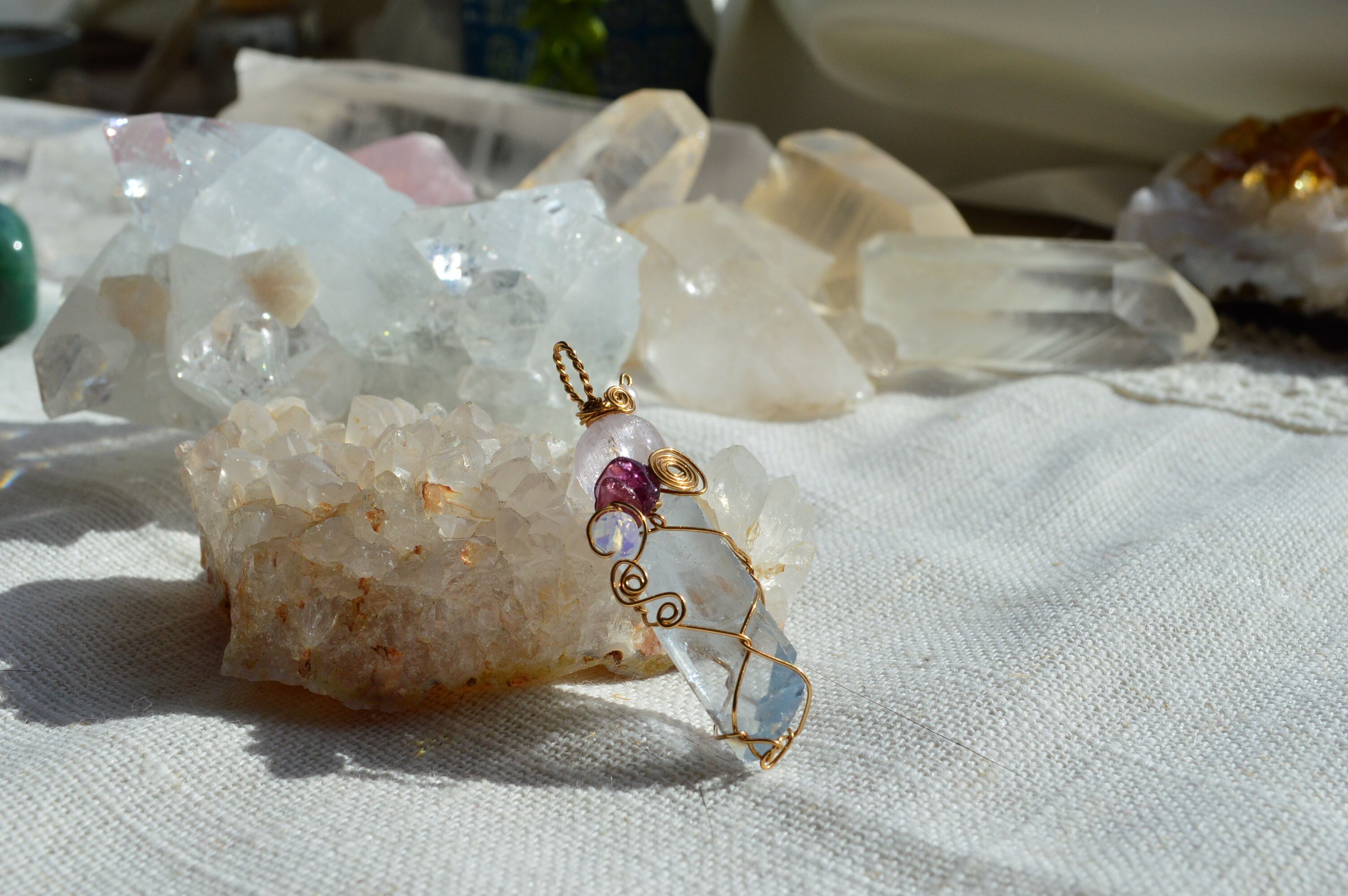 透き通る青の、とても優美で繊細なセレスタイト原石。これを傷つけぬようにそうっとワイヤーでくるみ、ペンダントトップにしました。この美しさとバランスが取れるのはクンツァイトしかないよね!それ以外思いつかない!!ということで、クンツァイト様とカップリング(*´Д`)エネルギーのバランスもあって、クンツァイト様もそれなりのサイズのものを使用しています。そのため、ワンドのようなデザインになっています。ペンダントとしても素敵ですが、このままサンキャッチャーのようにお部屋にディスプレイするのも良さそうです。
