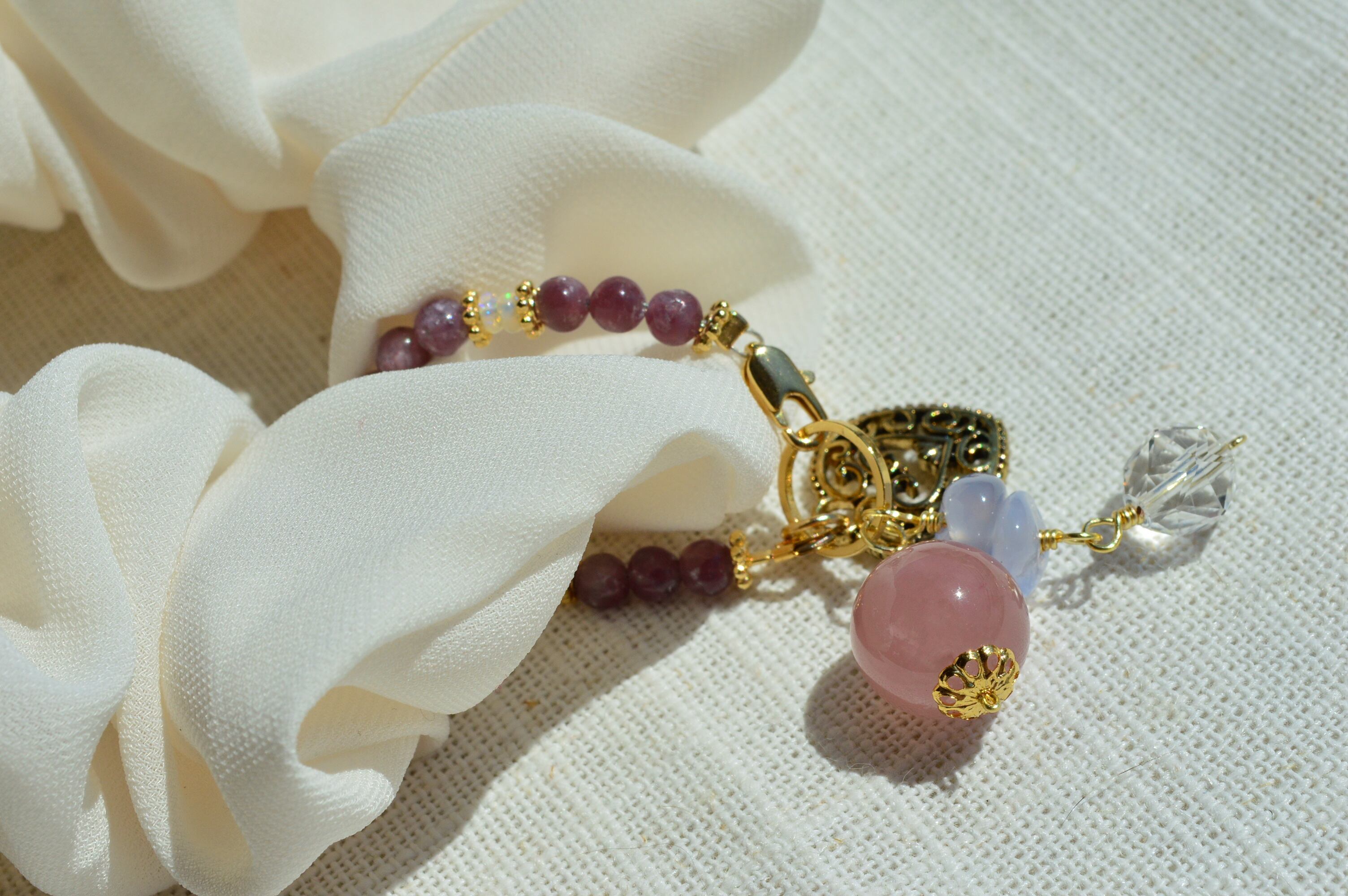少々引っ張っても壊れたり取れたりしないように、チャーム部分は可能な限り「閉じた」状態になるように仕上げました。石たちはめがね留めを施しているので簡単には取れません♪