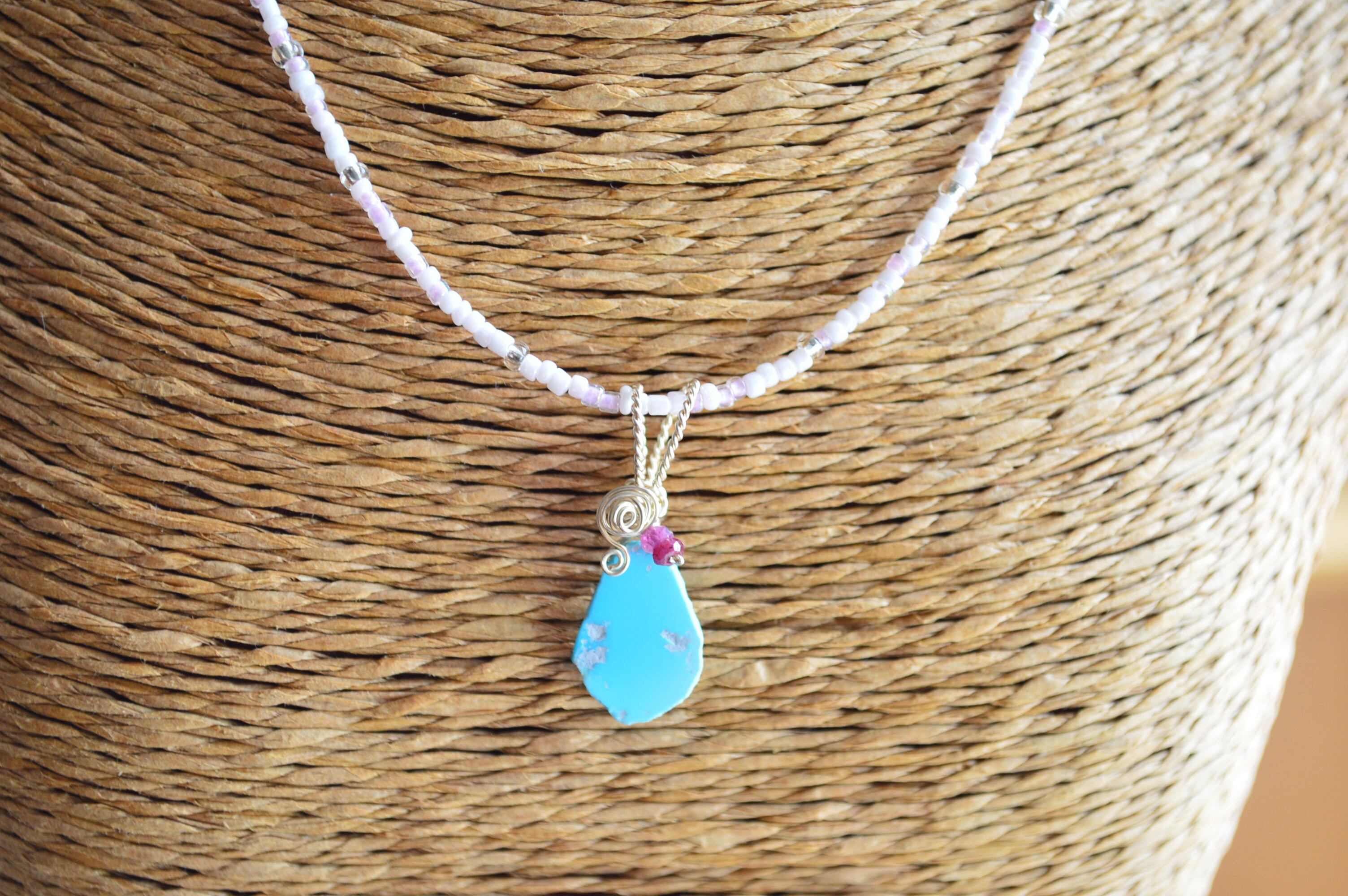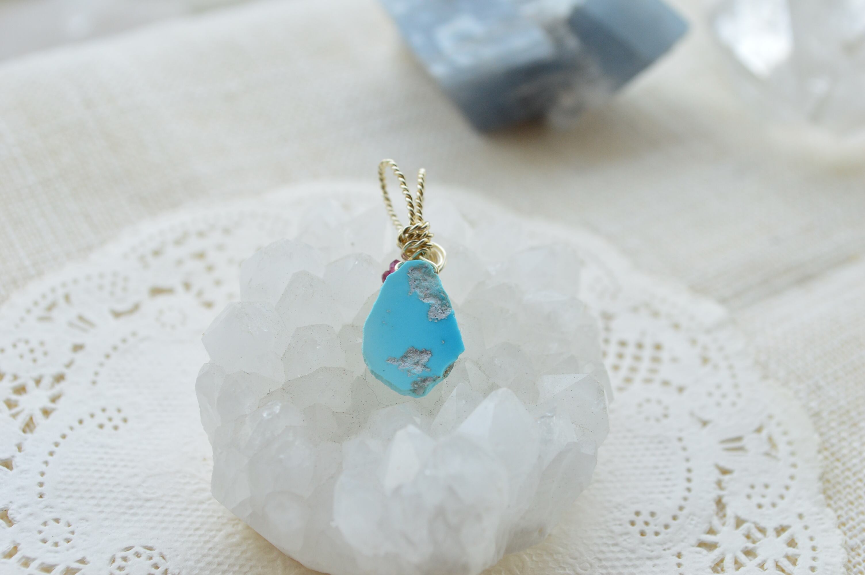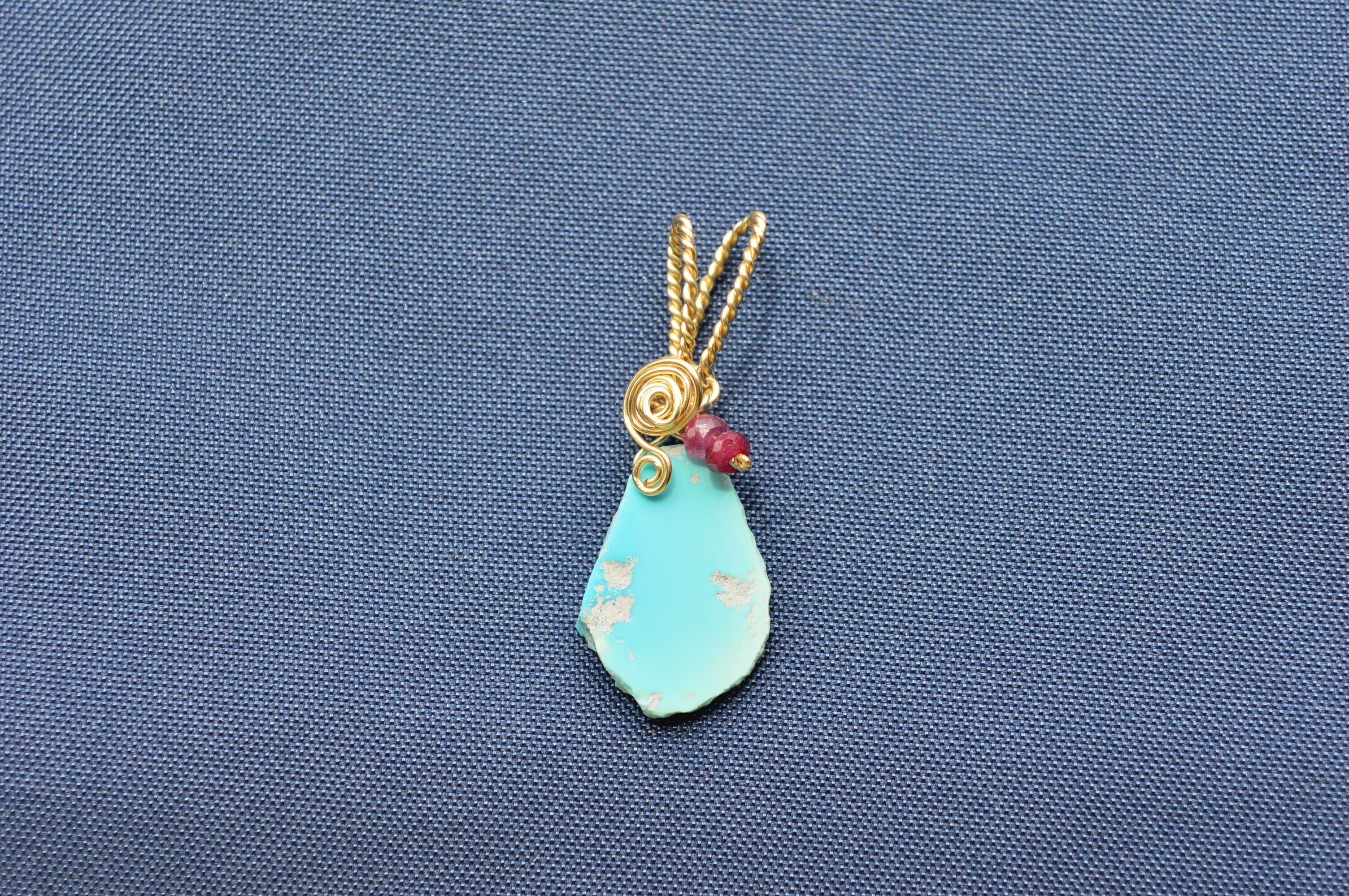 何より美しい!このターコイズを、いかに邪魔せずペンダントトップに仕上げるかに苦心しました。結果、添える石はシンプルに1種類のみ、穴に通せるのは細い番手のワイヤーだったので強度を増すため&デザインのためにねじり仕上げ、となりました(^^)
