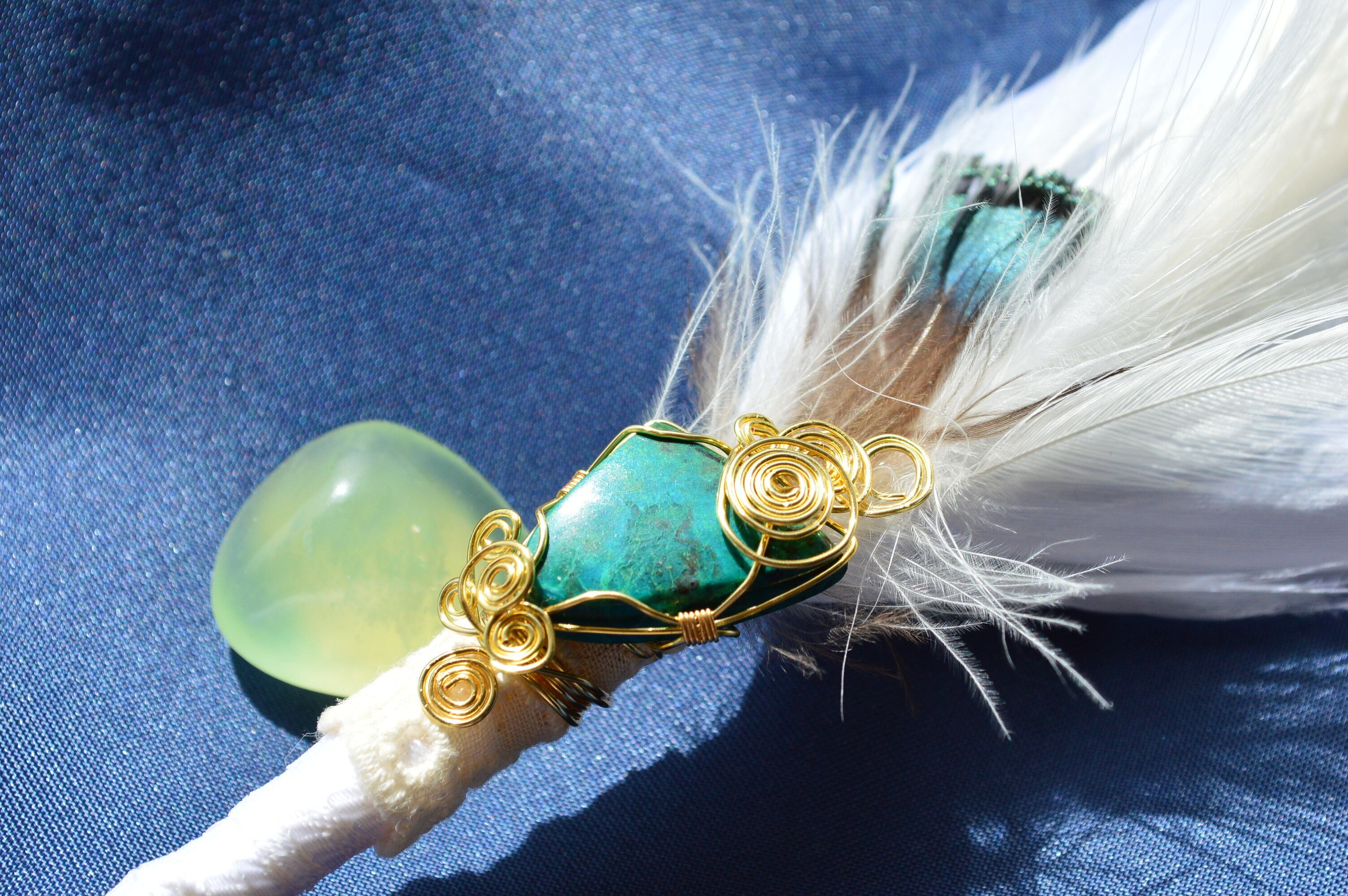 望みを描く、まっさらな心の象徴として本体は白い羽を使用し、あらゆるレベルの「豊かさ」と繋がり表現することのサポートとしてクリソコラを使用しております!