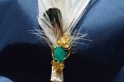 そして、この石に合わせて金鶏の小羽根を添えているのですが、こちら、光が差すとクリソコラに負けない、麗しいグリーンの輝きを見せてくれます(*´▽`*)