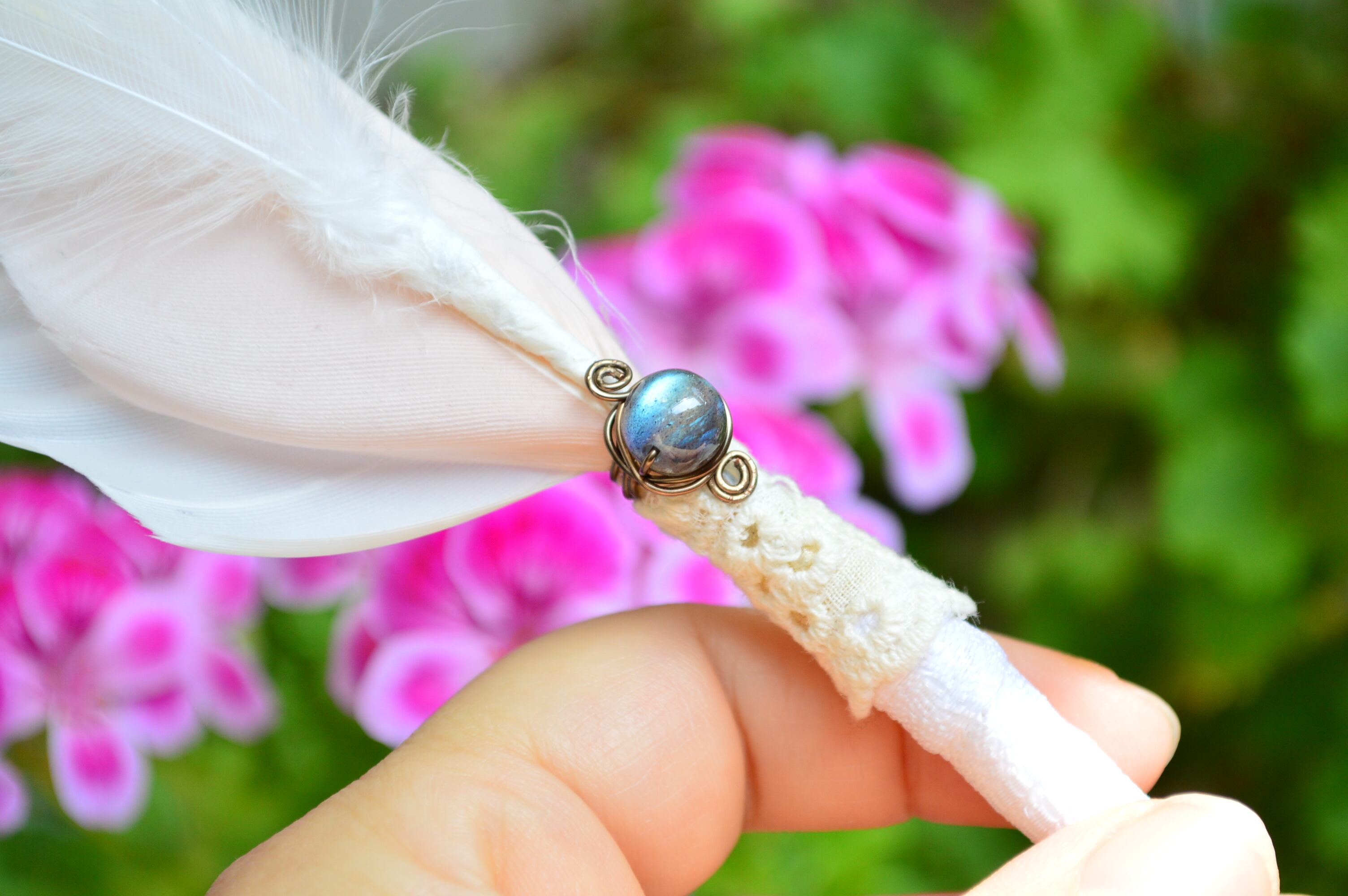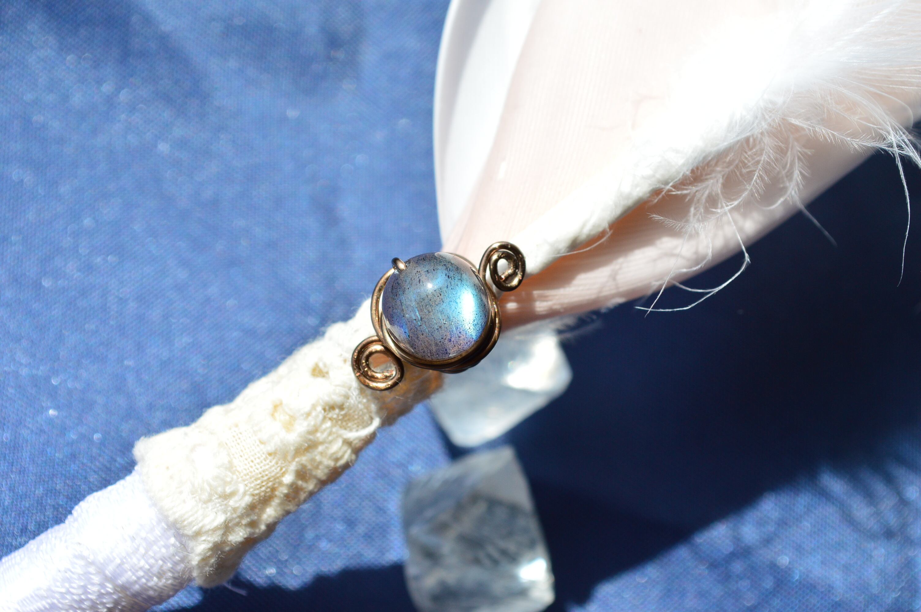 自分自身の制約を超えた、高次の叡智へ繋がることを助けてくれると感じます。この羽ペンに使用したラブラドライトは、高次の叡智へ繋がりつつ、それらを自身の中にある知識と結びつけ、統合するような働きもありそうです。うのみにさせるのではなくて、自分の言葉で理解し、表現することを助けてくれそうです。