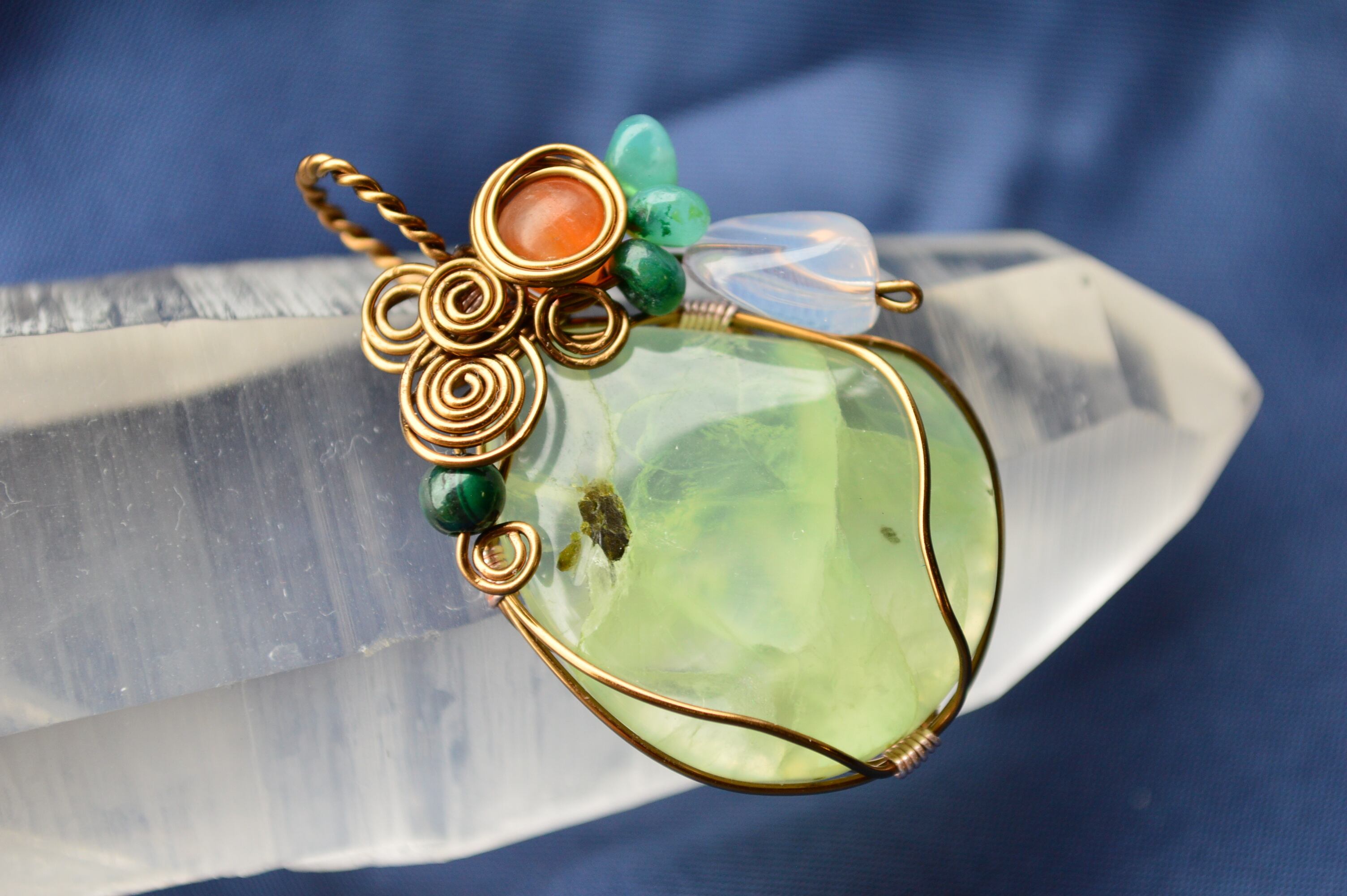 透明感あふれる、若々しくて瑞々しいプレナイトをガンメタカラーのワイヤーでデコレーション。プレナイトにかかるワイヤーの流れにも気を配った、オンリーワンの一品です♪