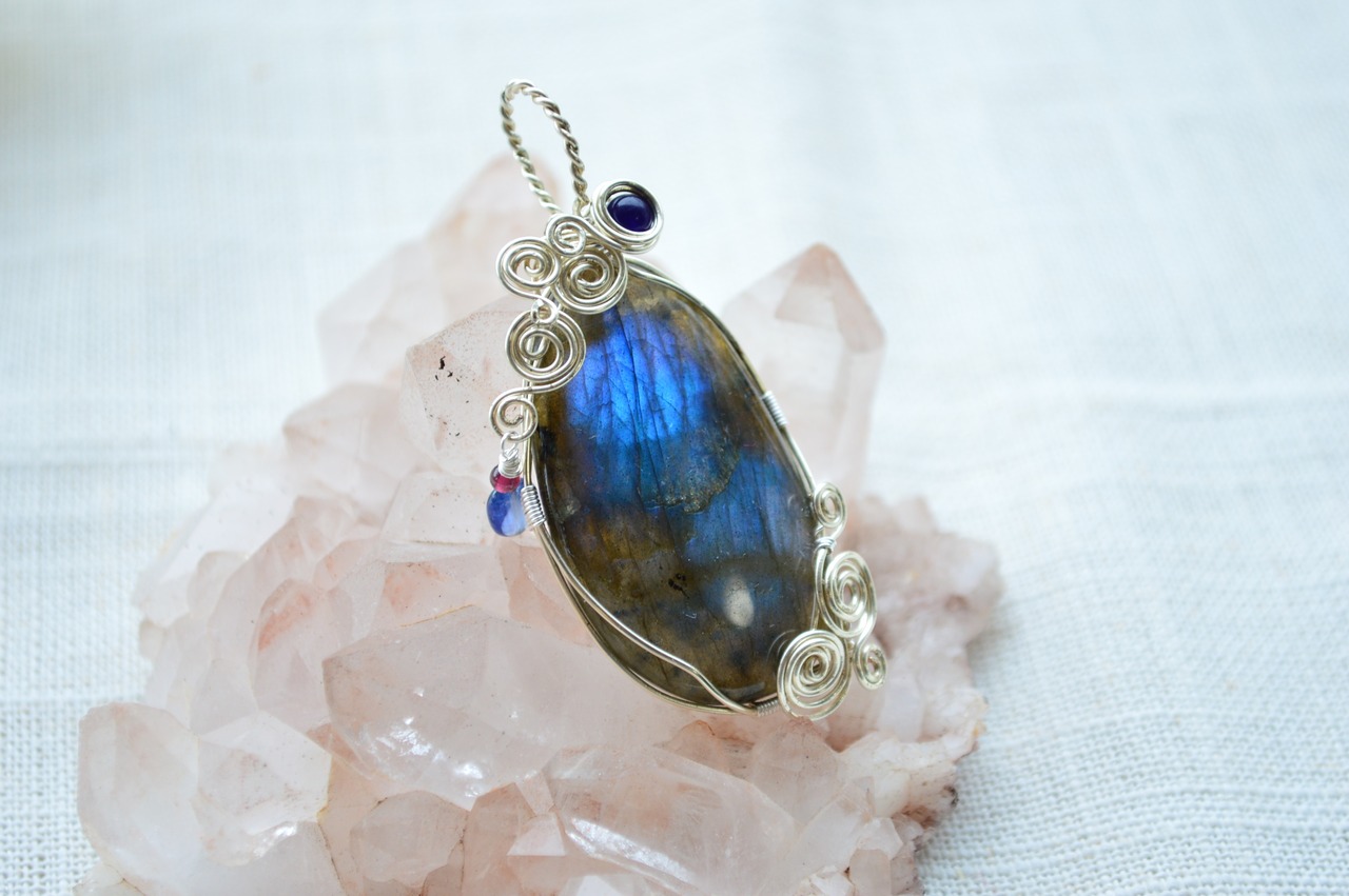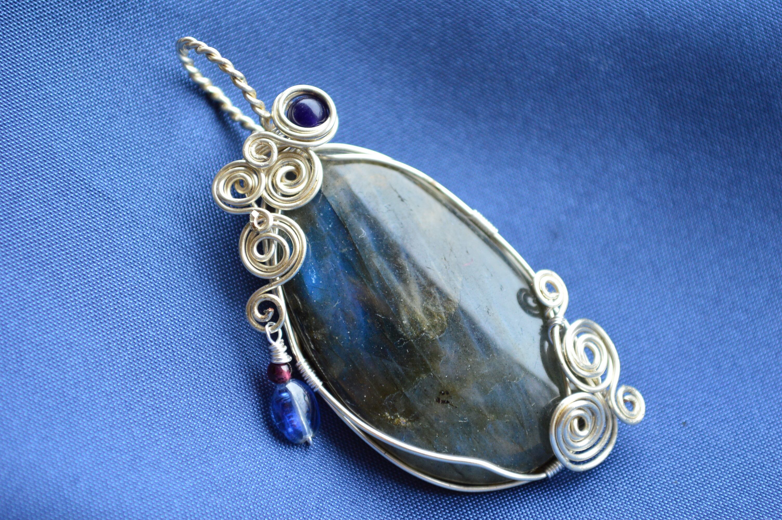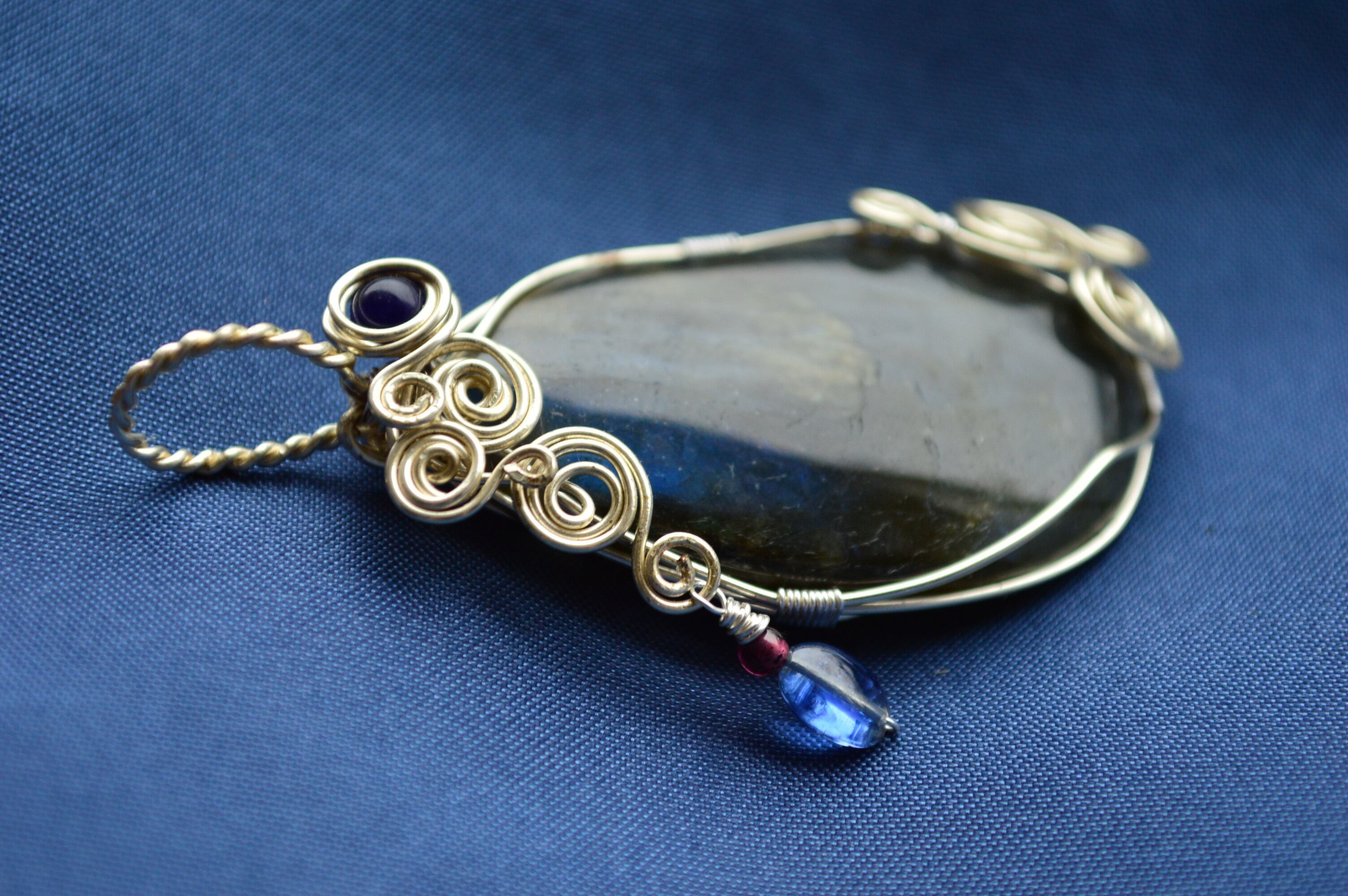 この特別な輝き、光の角度によりますので、身に着けた場合に常に輝くとは限らず・・・そんな時にも美しく身に着けていられるように、シルバーカラーのワイヤ―をふんだんに使用して巻き飾りを額縁のように施しました。飾りの石は同系色の青を最小限、ほんの僅かだけガーネットの赤を入れています。ちなみにこのワイヤーの巻き飾り、一度失敗して巻きなおしています・・・。ブルーが見えなくても華やかに身に着けていられるように、でも石の輝きは邪魔しないように、輝く青が最大限表現できるように。丁寧に丁寧に、今の私の最大限を込めて巻きあげました!