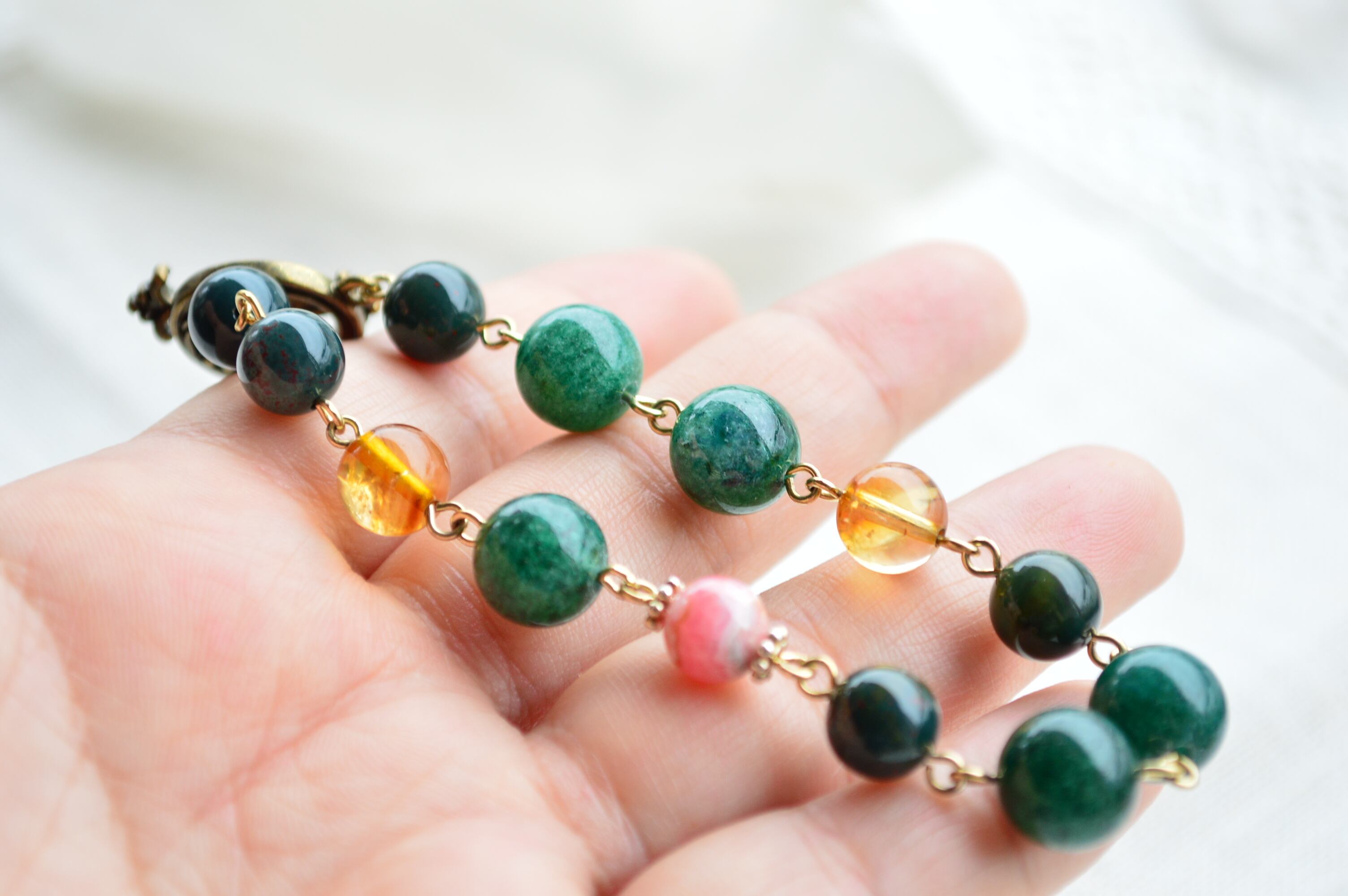 緑の石の一つ、アベンチュリンは、キラキラと輝く特有のアベンチュレッセンスが確認できる大きめサイズを使用しました。もう一つの緑の石、ブラッドストーンは、よく見ると名の由来となった赤い斑点がちゃんと確認できるものだけチョイス。この2種類の緑の濃淡が、深い森の木々のようで気に入っています♪アベンチュリンの煌めきが、木の葉の輝きのようでしょ?(^^)この森に差し込む日差しのように、シトリンを2粒。このシトリンには茶色のファントムが入っていて、このひとつぶの中に美しいグラデーションが存在しています。このシトリンとゴールドのピンによって、暗くならずにまとまったと思います!仕上げに、お花のような可愛いインカローズをプラスで、「豊かな森」が出来上がりました(*´▽`*)